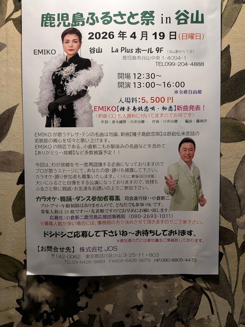 開店5周年でした。相変わらずお花がいっぱいでした。鹿児島ふるさと祭りが谷山であるようですね。小倉新二さんとEMIKOさんがいらっしゃるようです。
