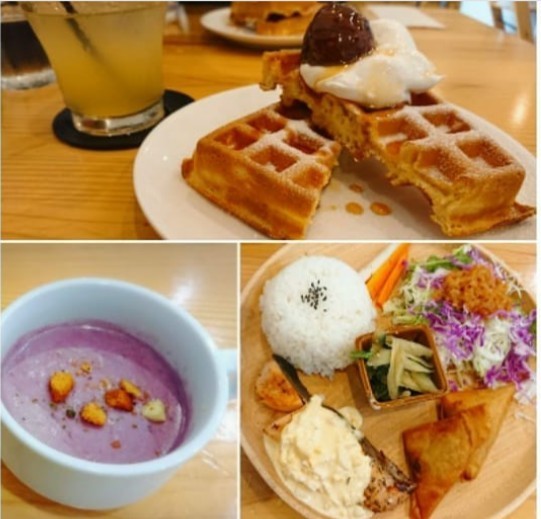 ランチとワッフルいただきました。ランチもいろいろな味つけで、ワッフルはやわらかく、どちらも満足で美味しかったです。