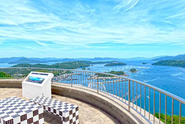 展望台から見えるは「薩摩松島」とも評される美しい景観。長崎県の雲仙天草国立公園も一望できます。展望台の1階にあるトイレも、ある意味すごいです(笑)。攻めてます。