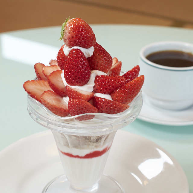 苺パフェは旬の時期だけ登場する期間限定。5月からはフルーツパフェ、夏は桃のパフェ、秋はシャインマスカットのパフェと主役が入れ替わるので、季節ごとに足を運ぶ楽しみもあります◎